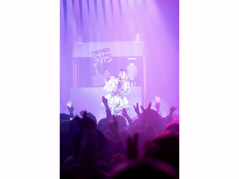 MCでは「シャトーブリアン」での掛け声を観客と一緒に練習。ゲットーハウスやゲットーテックを取り入れたBPM速めのダンスチューンに合わせ、会場からは一斉に「シャトーブリアン!」のコールが響く。牛柄の衣装に身を包み、「シャトーブリアン」と書かれたパネルを手に盛り上げるケンモチの姿も印象的だ。