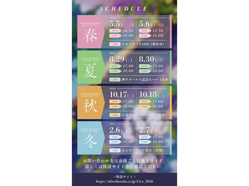 そのAfter the Rainが、アニバーサリーとなる2026年~2027年にかけて、「After the Rain 10th Anniversary Tour ~ 春夏秋冬 ~」と題したアリーナツアーを全国4都市にて開催すると発表した。