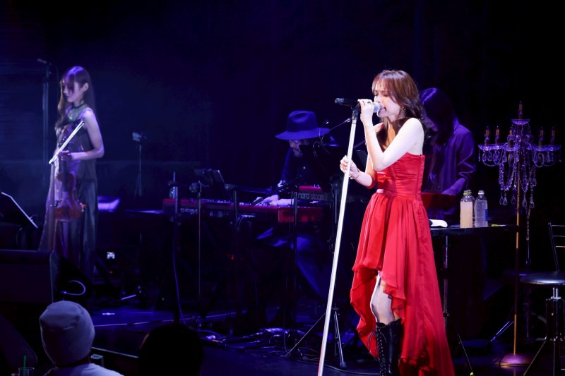 普段のパワフルなロックスタイルから一転、この日は鮮やかな赤いドレスを纏ってステージに登場。会場はビルボードならではの落ち着いたムードに包まれ、リリースされたばかりのベストアルバム「Rock ‘N’ Roll Journey -30th Anniversary Best」から、数年ぶりの披露となる「万華鏡」「月に捧ぐ」などの楽曲をはじめ、代表曲の数々がバイオリンを含めた豊穣なアレンジで披露された。