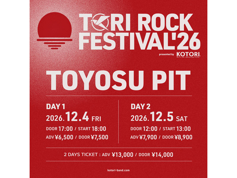 そのKOTORIが、主催フェス『KOTORI pre. TORI ROCK FESTIVAL’26』を東京・豊洲PITにて、12月4日(金)・5日(土)の2日間にわたり開催することを発表した。