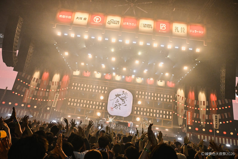 会場内には「にぎわいひろば」と名付けられた無料エリアも設置され、緑黄色屋台(フードエリア)や射的・輪投げ・転がし屋などが並んだ縁日ブースなどがあり、さらに場内には大きなやぐら、ステージには提灯や和太鼓も設置され、会場はまさに「祭」の装い。チケットは2日間共にソールドアウト。無料エリアを含み、2日間で30,000人の観客が会場に詰め掛けた。そんな2日間にわたる「緑黄色大夜祭2026」の模様をレポートする。
